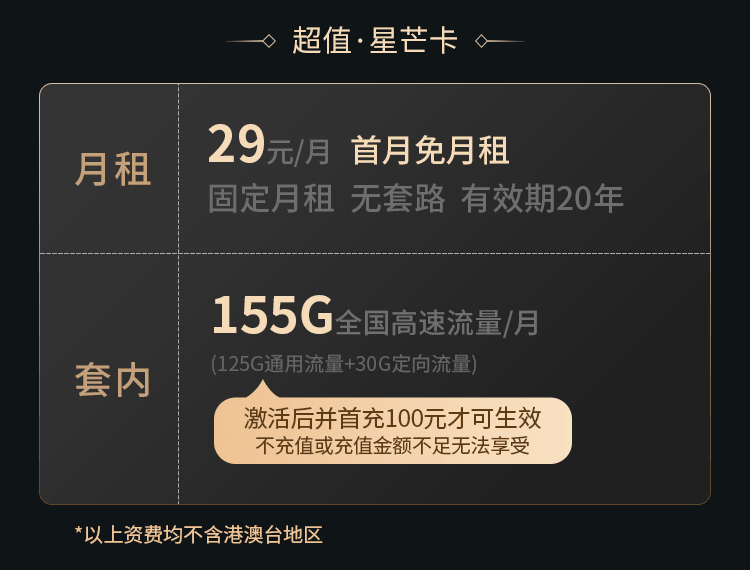 还是电信第一个听进去了,马上迭代了2款20年优惠期的流量卡,结合了用户不同需求做了不一样的改造,虽然29元155G,29元185G+100分钟听上去都很香,但是他们迭代的外围配置有没有真正击中我们,表哥还是要代替所有消费者群体测试一下。 套餐外资费:流量:5元/GB;语音: 0.1元/分钟;短信: 0.1元/条 申请入口:https://virtual.haoma.com/2i?seriesId=46648&source=001746